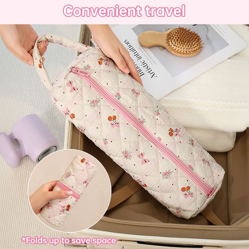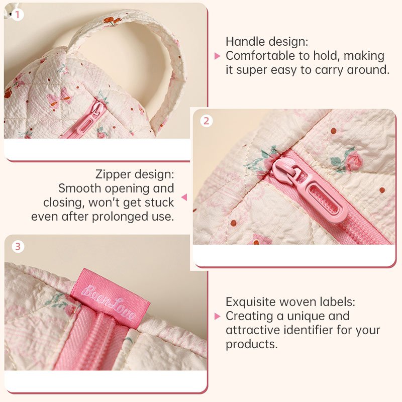 • Key Visuals: Roll-up cylindrical bag, featuring a light-colored background with pink floral print, pink zipper, and a carrying handle.